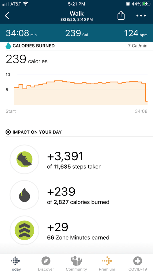 Provides users with daily and weekly graphs that visualizes the users recorded steps, zone minutes, floors, miles, and calories burned. The user is also able to log their food and water intake.